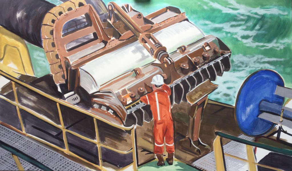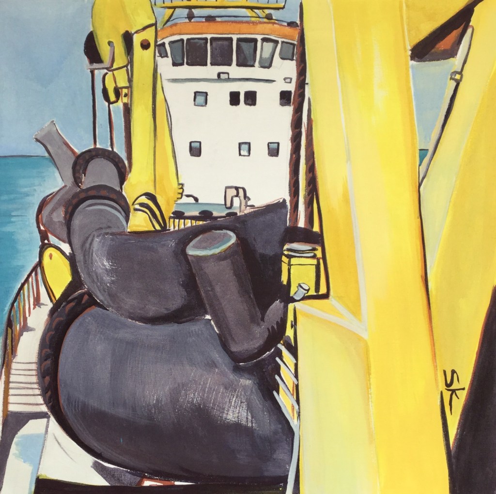 Dredgepipe 2019, tempera op linnen 80 x 80 cmFelled trees 2019, tempera op linnen. 140 x 140 cmCauaseway. 2019 tempera op linnen, 140 x 140 cmGangboord. 2019 tempera op linnen 140 x 140 cm