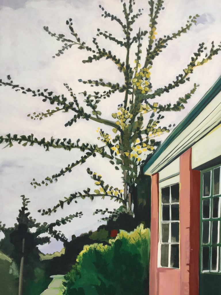 Gingko II of Trees in the street 2019, tempera op linnen, 100 x 125 cmGingko, 2019 tempera op linnen, 130 x 180 cmCeder 2019, tempera op linnen. 150 x 150 cmSwimmingpool in the backyard, 2019 tempera op linnen 100 x 160 cm