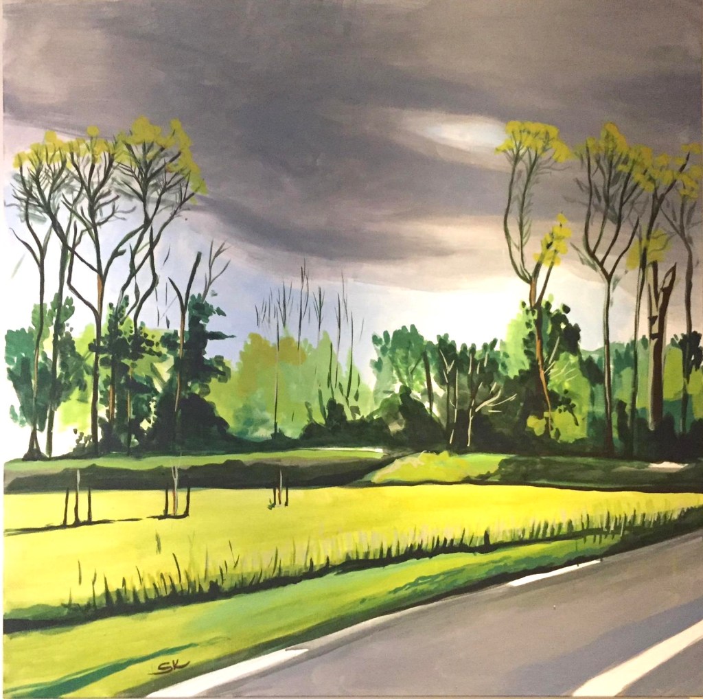 Road along the little woods, tempera op linnen, 2019 140 x 140 cmThe tree and school building, tempera op linnen, 2019 100 x 125 cm