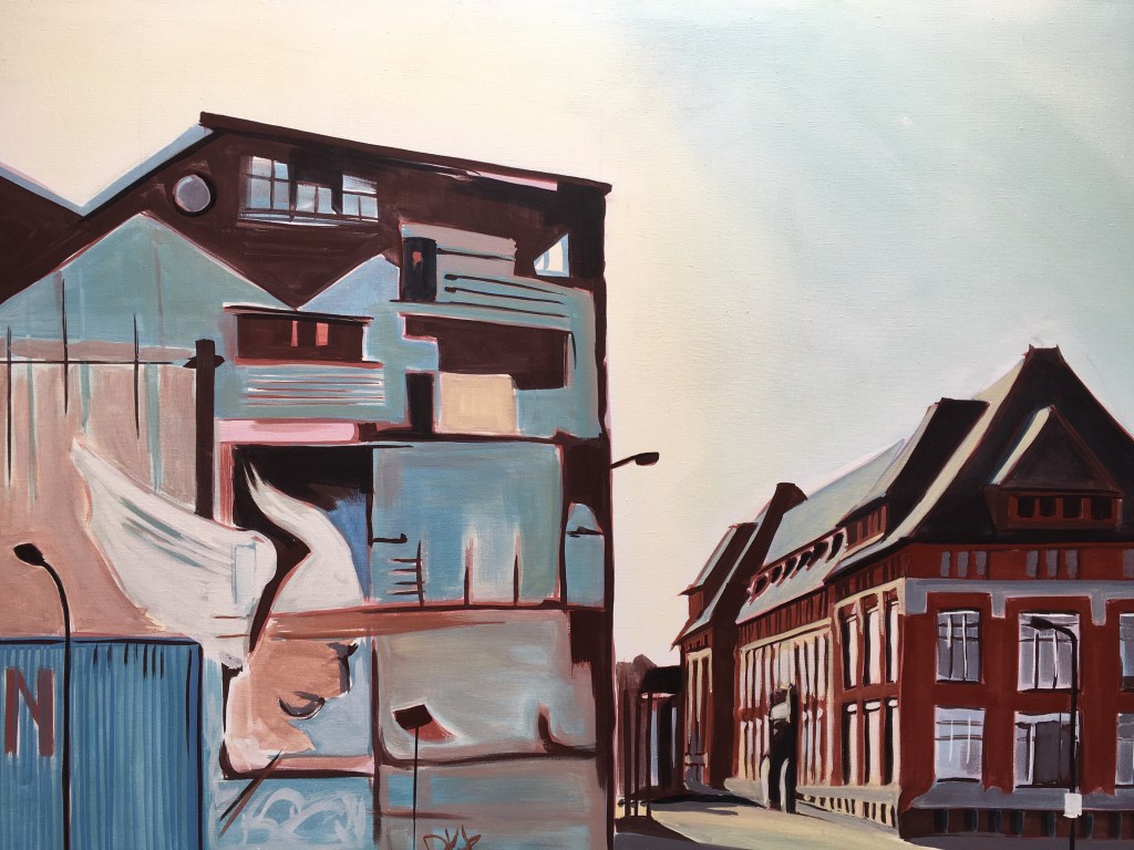 Timmerfabriek Vlissingen 2020, tempera op linnen, 140 x 140 cmSchelde gebouw 2020, tempera op linnen, 150 x 100 cm